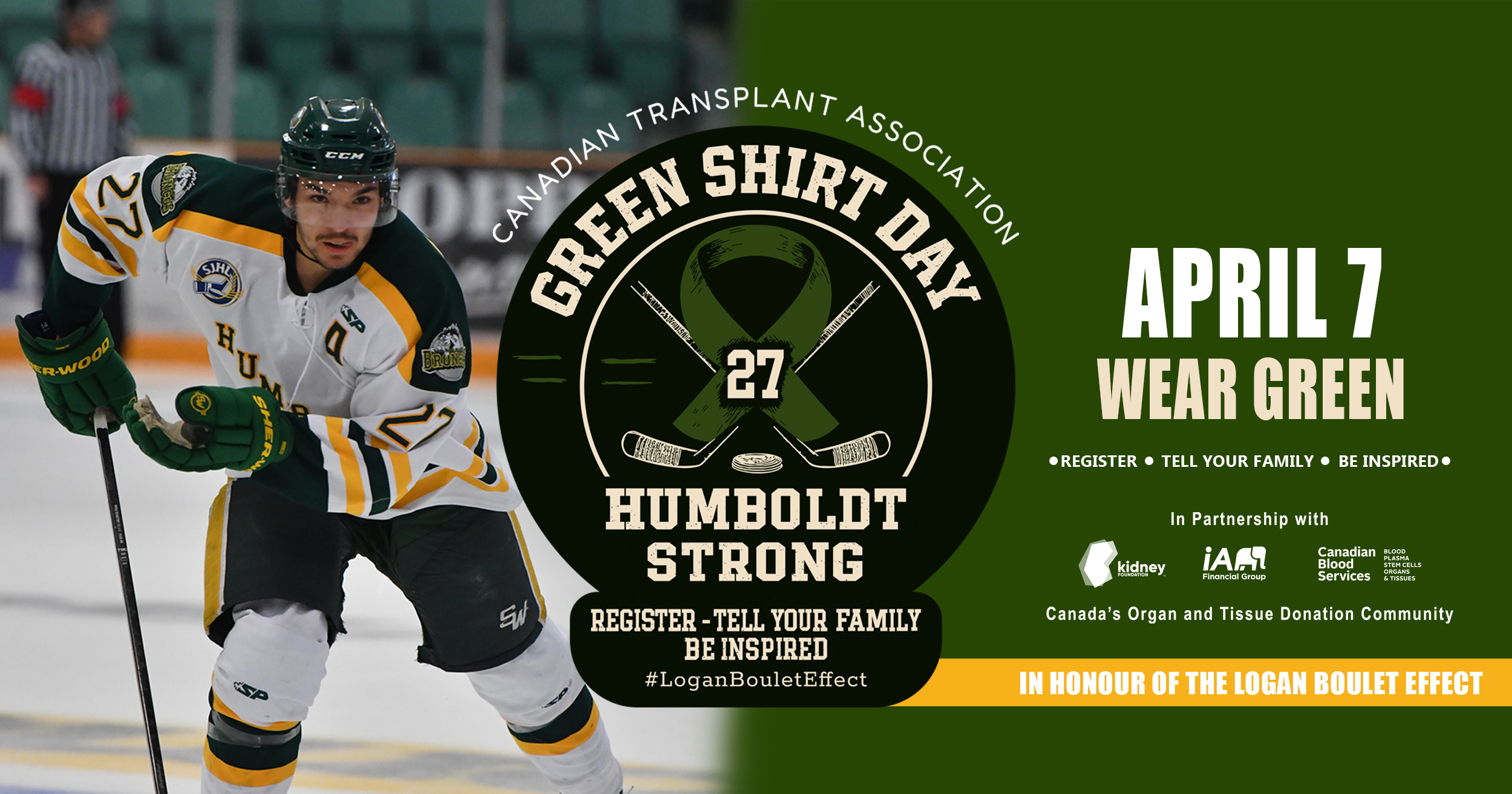 The worn hockey texture and dynamic composition make the design visually striking and full of movement. It’s surrounded by phrases central to the Green Shirt Day story — including #LoganBouletEffect and Humboldt Strong — creating a logo that honours the past while inspiring action for the future.